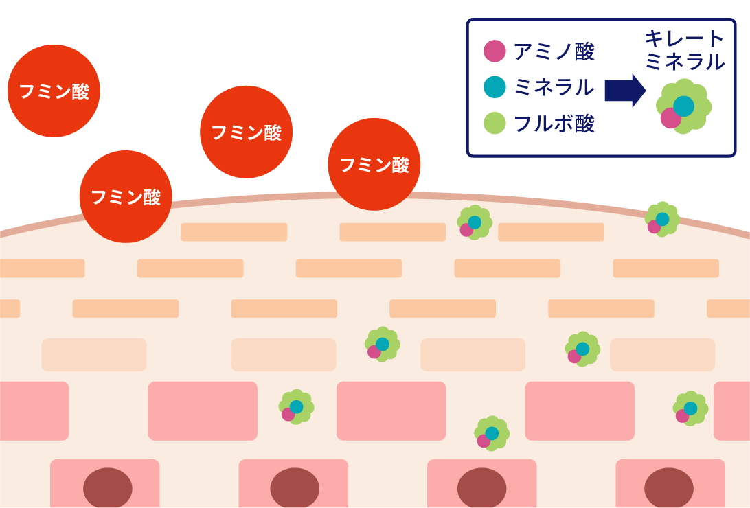 フルボ酸エキス※1に含まれる豊富なミネラルやアミノ酸は、「フルボ酸」と結合した作用により、キレートミネラルとなっています。この「キレートミネラル」は、水溶化した(イオン化ミネラル)ミネラル単体に比べ細胞や肌などへの浸透性が非常に高く、抗酸化力や保湿、ミネラル成分の供給を容易に行うことが可能です。