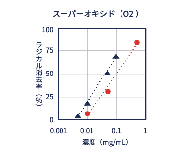 フルボ酸の濃度の増加に伴い、ラジカル消去率(活性酸素消去能)の増加が見られ、フルボ酸は、活性酸素(スーパーオキシド:O2,ヒドロキシラジカル:HO)を消去する作用のあることが確認されました。また、フルボ酸は、スーパーオキシドに対しては水溶性ビタミンE誘導体であるTroloxよりも高い消去能を示しました。