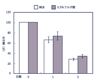 フルボ酸を添加した系では水分の減少を抑制し、フムスエキスに含まれるフルボ酸には保湿性のあることが確認されました。